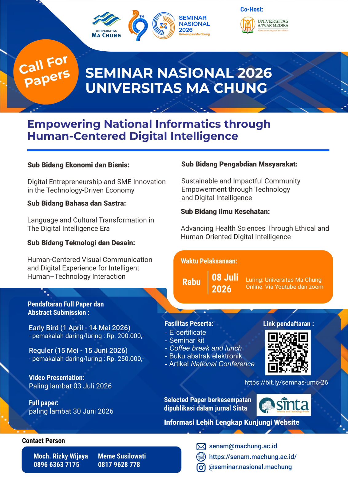 1) Sertifikat sebagai Peserta 2) Publikasi poster on-site di Universitas Ma Chung 3) Hasil Poster dapat diakses melalui website Seminar Nasional Universitas Ma Chung 4) Konsumsi |
